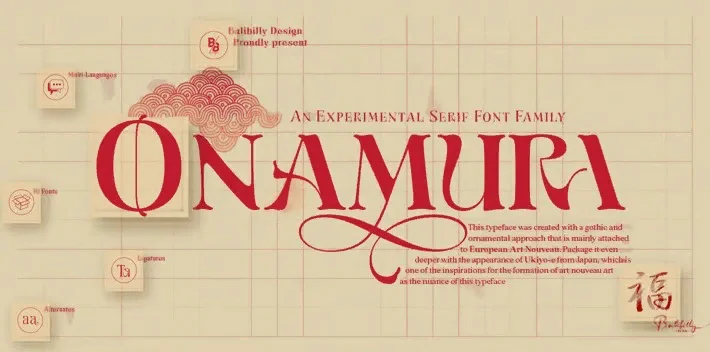 Отдавая дань уважения предшественникам, мы представили шрифт The Onamura в японском стиле укиё-э, который повлиял на движение изобразительного искусства, сломавшее старое консервативное искусство в Европе.