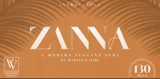 Zanna - это стильный современный и элегантный шрифт с засечками, с высоким контрастом и креативными лигатурами. Zanna была вдохновлена знаменитым шрифтом "Didot", что придает ей чувство стиля и моды с оттенком изысканности. Zanna также имеет очень тонкие линии и короткие засечки без скобок, что делает его стильным и шикарным. Шрифт представлен в двух стилях Regular и Stencil, каждый стиль имеет наклонную версию.