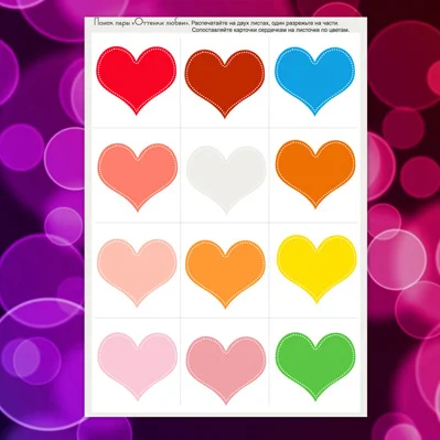1. Разрежьте один лист на карточки, а второй оставьте как есть. Задача ребенка сопоставить цвета и положить карточку сверху на совпадающее сердечко.