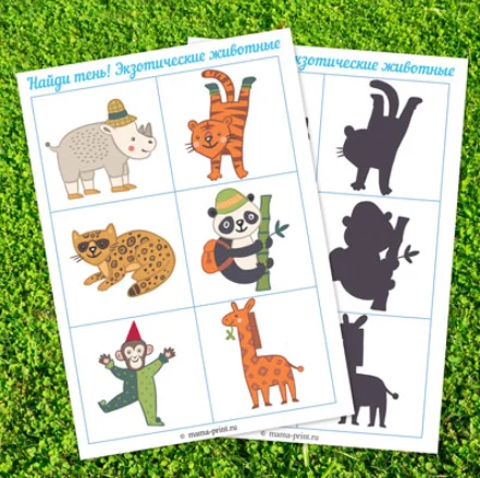 Упражнения по поиску одинаковых картинок и теней направлены на развитие устойчивости и концентрации внимания. А новые животные расширят кругозор ребенка