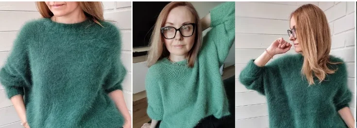 Изумрудный свитер связан из бобинной ангоры Biagoli Modesto Malo 650м/100гр в 2 нити, плотность 19п*22ряда, спицы 4 для основного полотна, 4,5 для кругового, 3 - для резинок.