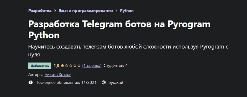 Python [Никита Хохлов] [Udemy] Разработка Telegram ботов на Pyrogram Python (2021)