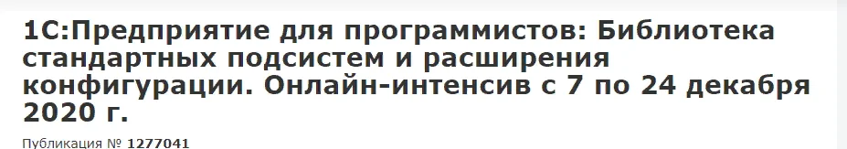 1С:Предприятие для программистов: Библиотека стандартных подсистем и расширения конфигурации. Онлайн-интенсив с 7 по 24 декабря 2020 г. Данный онлайн-курс предусматривает изучение механизмов платформы “1С:Предприятие”, обеспечивающих работу с расширениями конфигураций, а также изучение инструментария разработчика “1С:Библиотека стандартных подсистем” (БСП), представляющего собой набор универсальных подсистем и технологий для разработки прикладных решений на платформе “1С:Предприятие”. Курс предназначен для тех, кто уже имеет определенные навыки конфигурирования и программирования в системе “1С:Предприятие” и работает с типовыми конфигурациями.
