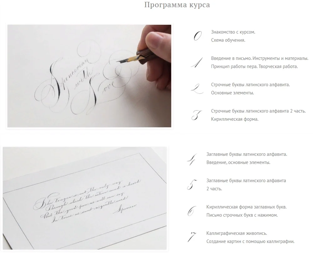 Перед вами фундаментальный курс письма стиля Spencerian, который поможет погрузиться в красоту письма тонким пером! И главное в нем — это авторская программа, которую я разрабатывала и улучшала на своих очных курсах. Обучение базируется на подробном разборе каждой буквы с большим количеством прописей.