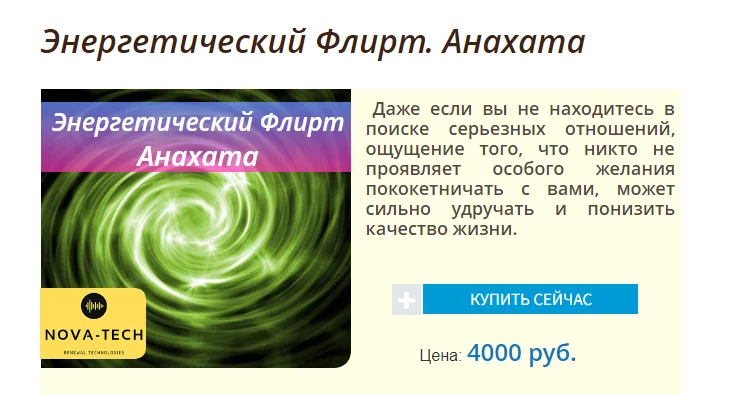 В этом аудионастрое мы собрали максимально возможное количество позитивных установок, нейтрализующих всевозможные физические и эмоциональные блоки в энергетическом центре Анахата. Постепенно энергетический флирт прочно войдет в вашу жизнь и будет оказывать влияние на все ее сферы. Как уже было сказано, энергетический флирт позволит вам соблазнить не только противоположный пол, но и весь мир, получая от него то, что вы пожелаете.