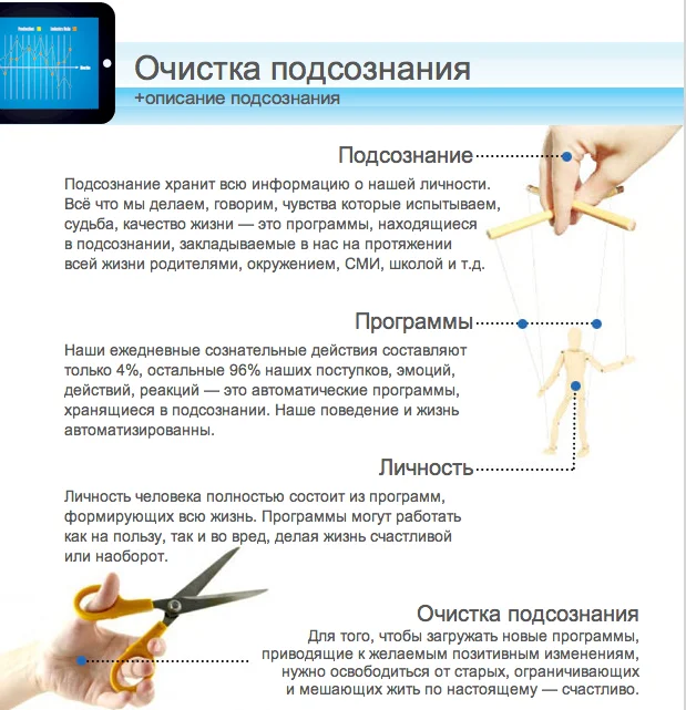 Программа Очистка Подсознания снимает эти запреты (ограничивающие убеждения) и позволяет вам загрузить себе в подсознание любые желаемы развивающие убеждения, такие как: у меня всё получается, я счастливый человек, я общительный собеседник, и любые другие, которые вам нужны. Эти убеждения являются кирпичиками нашего взгляда на жизнь, нашего поведения и самой нашей жизни.