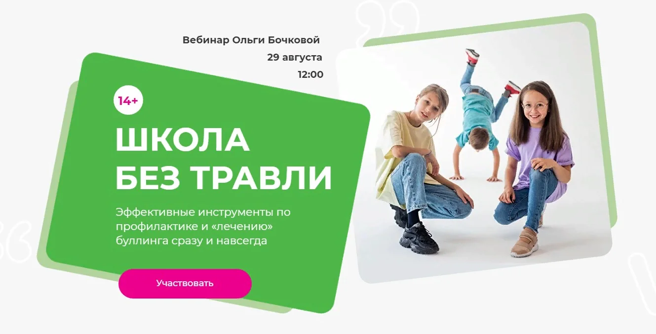 Помимо нескольких профильных образований в России, Ольга закончила программу защиты и представления интересов детей в Kidower.org, США — организации, которая уже более 30 лет успешно помогает детям бороться с буллингом. Именно поэтому в вебинаре задействованы только самые эффективные и проверенные методы работы с проблемой.
