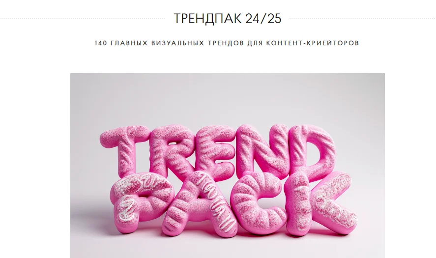 Трендпак - это выжимка всего самого главного, что нужно знать о трендах в визуальном мире всем, кто хочет зарабатывать визуалом (не важно - фотографируете вы, создаете иллюстрации или генерации) Только понимая тренды можно создавать актуальный контент, за который клиенты готовы платить