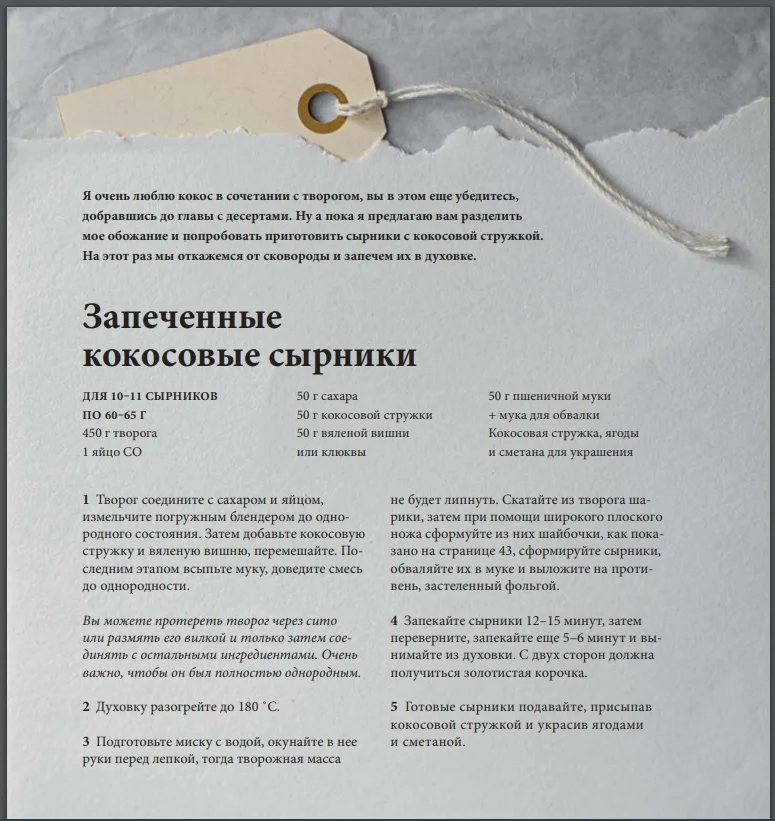 Если при слове «творог» у вас в мыслях всплывают картинки только сырников и запеканки, то вы не знаете о твороге ровно ничего. Не знаете о сочетании творога с белым шоколадом или воздушным тыквенным пюре, никогда не соединяли творог с лимоном и медом, чтобы получить самую вкусную в мире ватрушку. Но это не страшно, ведь Олеся Куприн поможет разобраться вам в этом вопросе! В ее новой книге целых семь разделов подробно расскажут и покажут вам, чем так прекрасен творог и что с ним можно сделать на кухне. Шоколадно-банановая запеканка, королевская ватрушка, кокосовые сырки с черным джемом и творожный пирог с зеленью… Вы уже заинтригованы? Тогда скорее берите книгу и заполняйте ее закладками на понравившихся рецептах.