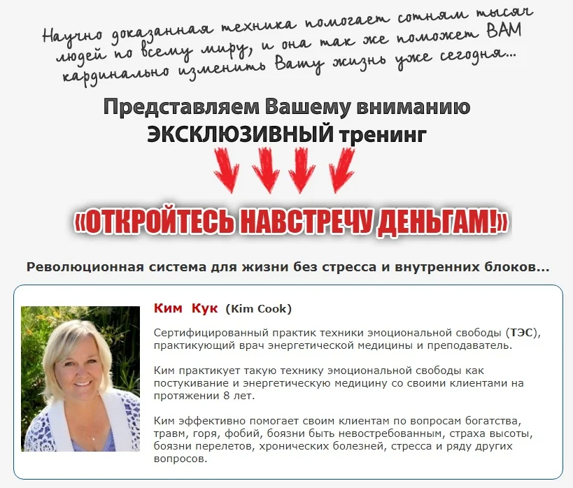 На тренинге " Откройтесь навстречу деньгам", вы откроете для себя простой, легкий в применении способ, который значительно улучшит все области вашей жизни таким образом, что вы никогда не подозревали, что это возможно...
