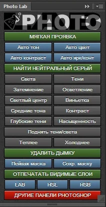 Панель Photo Lab работает в версиях Photoshop CC, CC-2015 и последующих. Панель содержит предустановки для быстрой обработки фотографий и позволяет гораздо быстрее и более гибко управлять различными параметрами изображения. Возможности панели: подготовка к обработке (мягкая проявка), автоуровни с возможностью точной подстройки под конкретное изображение, поиск точек 50% серого на любом изображении (баланс белого), кнопки коррекции основных параметров изображения, удаление дымки, создание пейзажной маски в полуавтоматическом режиме (небо/земля), Работа в цветовых пространствах LAB, HSL, HSB , не выходя из цветового пространства RGB