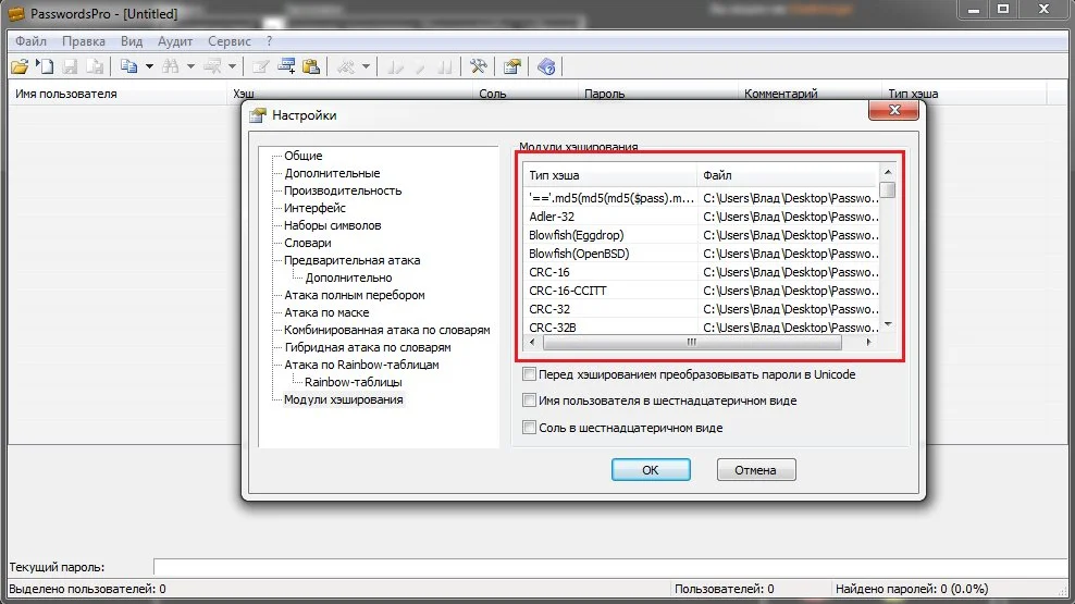 a)Добавление модулей. Заходим в Сервис -> Настройки(F9), далее вкладка Модули хеширования. Нажимаем правой клавишей на пустом месте и нажимаем ДОБАВИТЬ, откроется окно для выбора файлов,заходим в папку с программой,затем в папку Modules выделяем все модули и нажимаем открыть. Мы должны увидеть: