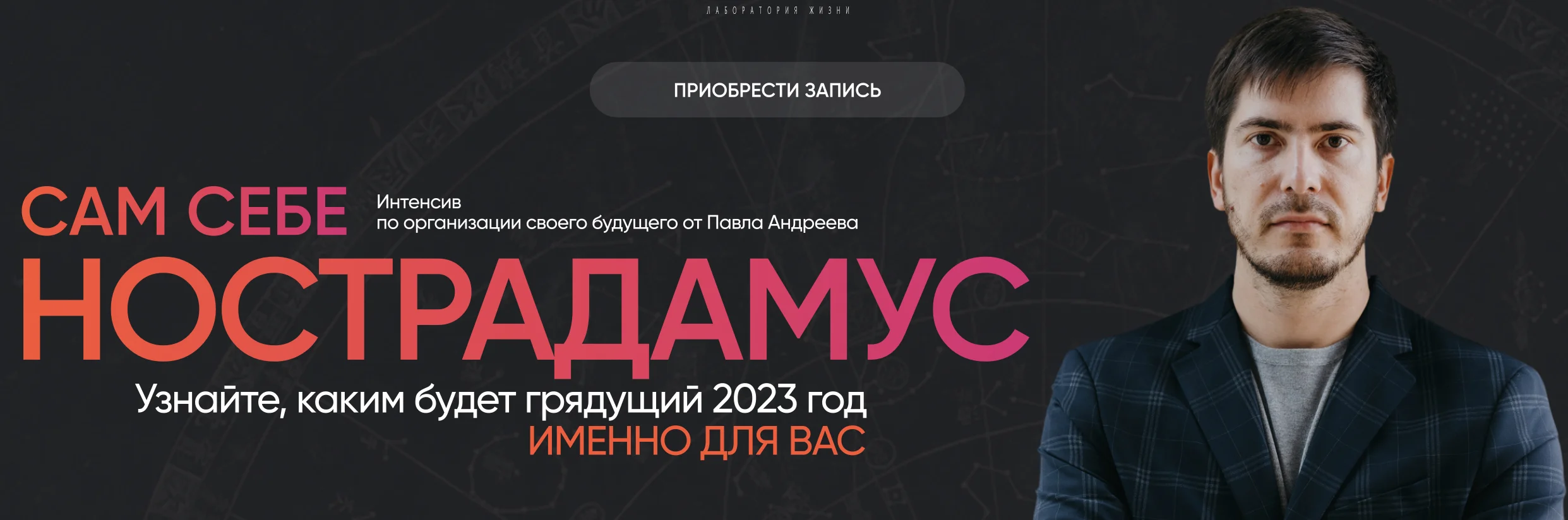 - Участие в игре "Сам себе Нострадамус" для расчета коридора событий своего будущего в 2023-м году: научитесь строить карты; сопоставите энергетические тренды неба со своей судьбой; узнаете базовые техники, как компенсировать негативные прогнозы; познакомитесь с методикой усиления своих намерений, чтобы программировать небо на исполнение ваших "Хочу".