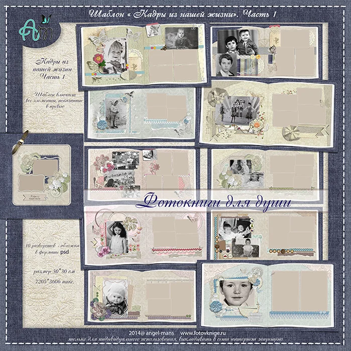 Шаблон фотокниги «Кадры из нашей жизни«. Состоит этот шаблон из трех частей, отличающихся по стилистике и дизайну. Каждую часть с легкостью можно использовать для оформления отдельной фотокниги или объединить все три части в одну.