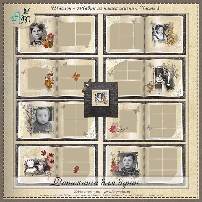 Шаблон фотокниги «Кадры из нашей жизни«. Состоит этот шаблон из трех частей, отличающихся по стилистике и дизайну. Каждую часть с легкостью можно использовать для оформления отдельной фотокниги или объединить все три части в одну.