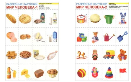 По 16 карточек на темы: Мир человека-1: Продукты питания, Посуда, Мебель, Одежда и обувь;