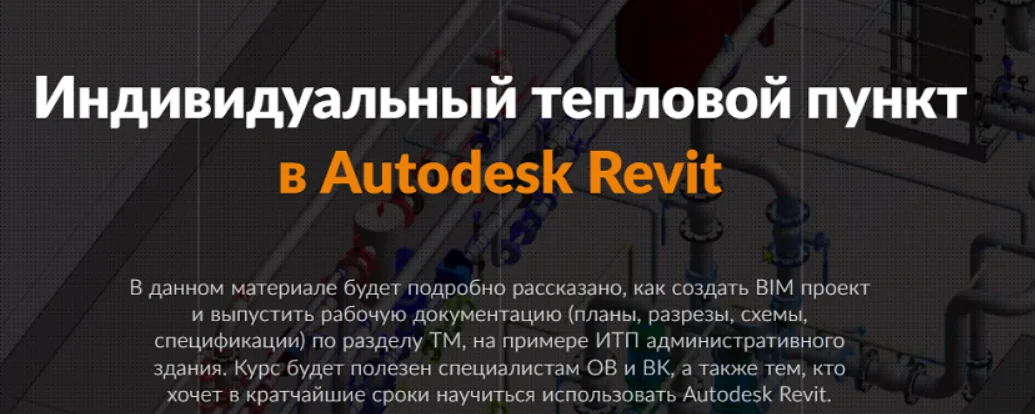 на примере ИТП административного здания. Курс будет специалистам ОВ и ВК, а также тем, кто хочет в кратчайшие сроки научиться использовать Autodesk Revit.