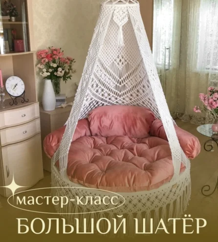 Вы сплетете шатёр в технике макраме, в который можно забраться с ногами и отдыхать, покачиваясь. Узор шатра в МК точно такой же как на фото