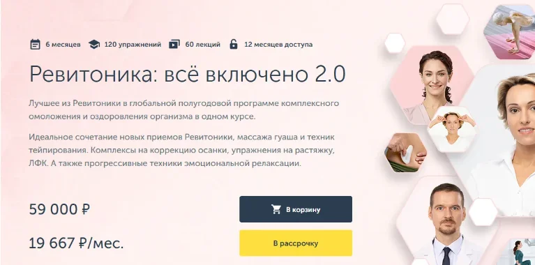• Топовые приемы всех курсов и профессиональные техники школы Ревитоника объединены в полугодовую программу комплексного омоложения всего организма