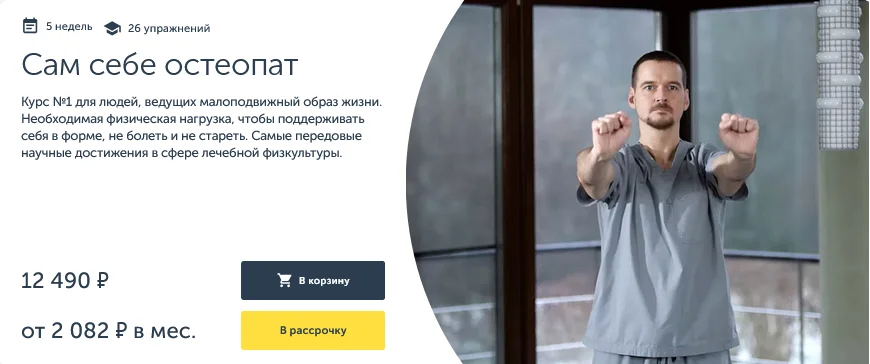 «Сам себе остеопат» нужен тем, кто «живёт» за офисным столом, в пробках, по разным причинам не занимается спортом. Самые эффективные и безопасные приемы ЛФК, пилатеса, йоги и остеопатии собраны в последовательную программу, учитывающую механизмы физиологической адаптации организма для всех уровней подготовки. За 5 недель вы полностью преобразитесь на уровне мышц, фасций, связок и каждой клеточки