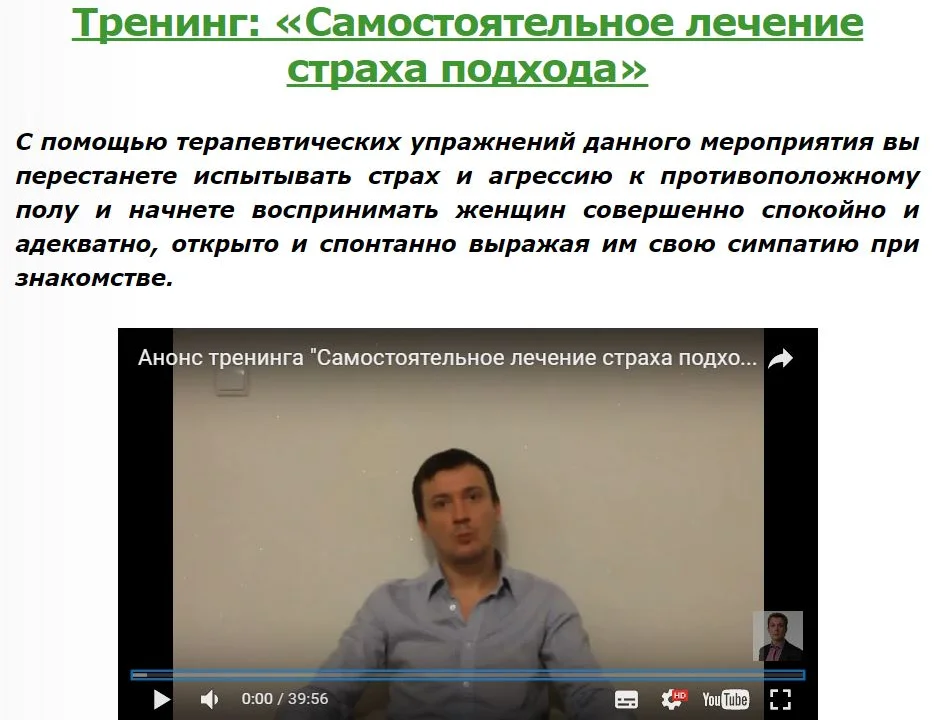 С помощью терапевтических упражнений данного мероприятия вы перестанете испытывать страх и агрессию к противоположному полу и начнете воспринимать женщин совершенно спокойно и адекватно, открыто и спонтанно выражая им свою симпатию при знакомстве.