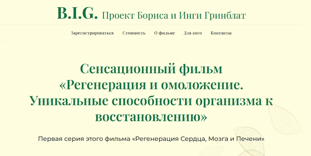 B.I.G. Проект Бориса и Инги Гринблат. Фильм состоит из нескольких видео лекций Сайера Джи, автора революционной книги «Регенерация. Раскрытие уникальной способности к восстановлению вашего тела с помощью Новой Биологии».