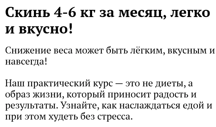 Наш практический курс — это не диеты, а образ жизни, который приносит радость и результаты. Узнайте, как наслаждаться едой и при этом худеть без стресса.