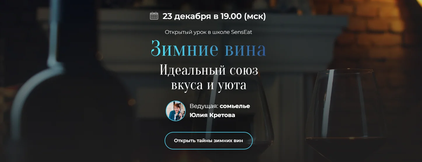 Вместе с экспертом в области виноделия Юлией Кретовой мы обсудим, какие вина лучше всего подходят для холодного времени года, как их правильно сочетать с зимними блюдами, и как создать идеальную атмосферу для зимних вечеров.
