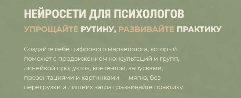 Создайте себе цифрового маркетолога, который поможет с продвижением консультаций и групп, линейкой продуктов, контентом, запусками, презентациями и картинками — мягко, без перегрузки и лишних затрат развивайте практику