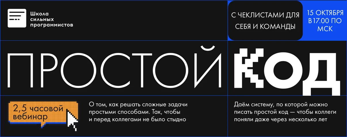 Устали от кода, который через месяц не можете понять сами? Боитесь показывать свой код коллегам? Этот вебинар для тех, кто хочет писать простой, понятный и поддерживаемый код.