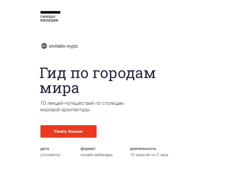 На курсе из 10 вебинаров взглянем на популярные у путешественников места и города по-новому. Составим свой путеводитель по мировым архитектурным столицам. Увидим новые смыслы в уже известных шедеврах градостроительства и узнаем секреты площадей, улиц и соборов, о которых не пишут в туристических буклетах.