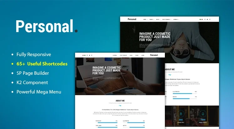 Благодаря гибкой панели администратора с Helix 3 Framework и SP Page Builder (бесплатная версия), Sj Personal позволяет быстро настроить и легко настроить веб-сайт. С плагином YT Shortcode V3 вы можете создавать красивое и сложное содержимое, не касаясь кода. Sj Personal - бесплатный шаблон Joomla действительно отлично подходит для сайтов профиля или личной службы, чтобы рекомендовать себя на своей странице, например, в личном блоге.