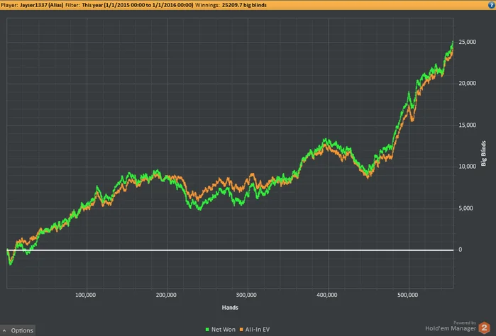 Индивидуальные занятия Джейсера стоят 500$/час, а винрейт на лимитах NL400-NL2000 достиг 7bb/100, при более чем 250 выигранных бай-инах за последние 500к рук в этом году.