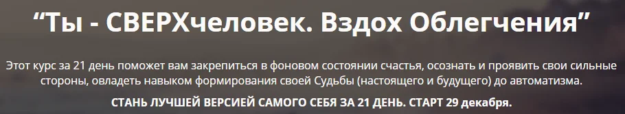 Этот курс за 21 день поможет вам закрепиться в фоновом состоянии счастья, осознать и проявить свои сильные стороны, закрепить навык формирования своей Судьбы до автоматизма.