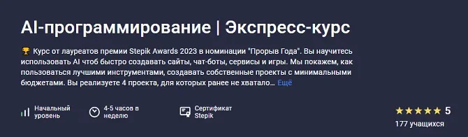 Курс от лауреатов премии Stepik Awards 2023 в номинации "Прорыв Года". Вы получите обучение от лучших специалистов в области AI-программирования.