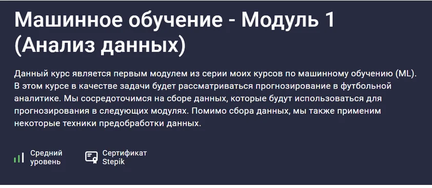 Данный курс является первым модулем из серии моих курсов по машинному обучению (ML). В этом курсе в качестве задачи будет рассматриваться прогнозирование в футбольной аналитике. Мы сосредоточимся на сборе данных, которые будут использоваться для прогнозирования в следующих модулях. Помимо сбора данных, мы также применим некоторые техники предобработки данных.