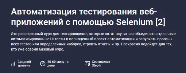 Важно! Для прохождения этого курса необходимо предварительно освоить базовый курс Автоматизация тестирования веб-приложений с помощью Selenium, т.к. в нём изучаются основные команды автоматизации, используемые в этом курсе.