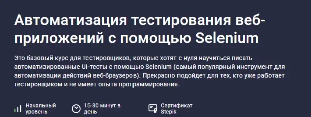 Это базовый курс для тестировщиков, которые хотят с нуля научиться писать автоматизированные UI-тесты с помощью Selenium (самый популярный инструмент для автоматизации действий веб-браузеров). Прекрасно подойдет для тех, кто уже работает тестировщиком и не имеет опыта программирования.
