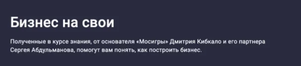 Полученные в курсе знания, от основателя «Мосигры» Дмитрия Кибкало и его партнера Сергея Абдульманова, помогут вам понять, как построить бизнес.