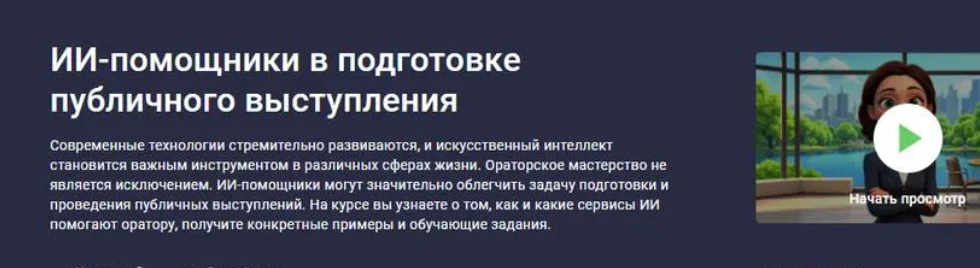 Современные технологии стремительно развиваются, и искусственный интеллект становится важным инструментом в различных сферах жизни. Ораторское мастерство не является исключением. ИИ-помощники могут значительно облегчить задачу подготовки и проведения публичных выступлений. На курсе вы узнаете о том, как и какие сервисы ИИ помогают оратору, получите конкретные примеры и обучающие задания.