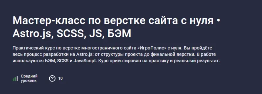 В результате вы создадите полноценный многостраничный сайт «ИгроПолис» по авторскому макету, получите практический опыт работы с Astro.js, БЭМ, SCSS и JavaScript, а также понимание того, как организовывать код в реальных проектах.