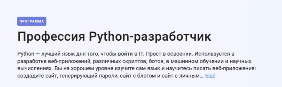 Python – лучший язык для того, чтобы войти в IT. Прост в освоении. Используется в разработке веб-приложений, различных скриптов, ботов, в машинном обучении и научных вычислениях. Вы на хорошем уровне изучите сам язык и научитесь писать веб-приложения: создадите сайт, генерирующий пароли, сайт с блогом и сайт с личным портфолио. Вы научитесь работать с базами данных (БД): сможете писать код на языке SQL, а так же опрашивать БД на стороне приложения, написанного на Python.