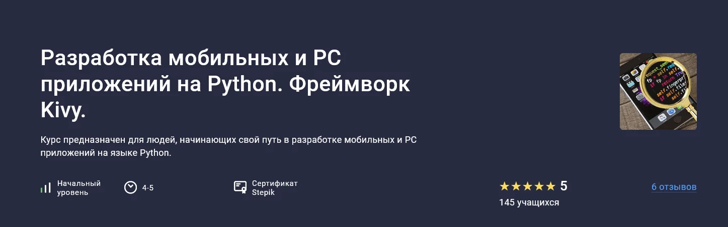 Особенностью курса является то, что он подходит как для начинающих, так и для тех, кто уже имеет опыт в программировании на языке Python. Кроме того, курс предоставляет возможность создания приложений как для мобильных устройств, так и для ПК.