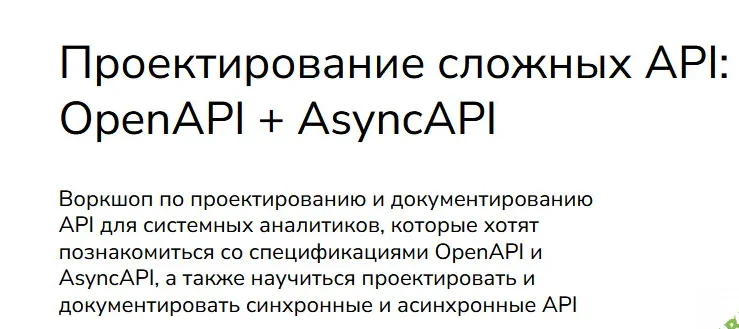 Воркшоп по проектированию и документированию API для системных аналитиков, которые хотят познакомиться со спецификациями OpenAPI и AsyncAPI, а также научиться проектировать и документировать синхронные и асинхронные API