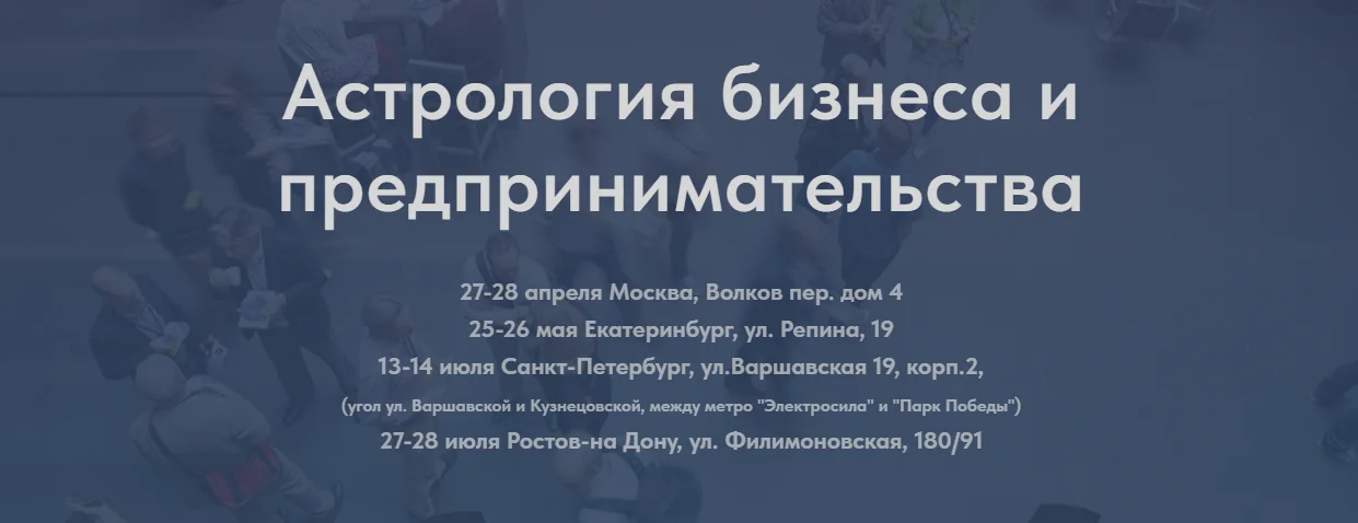 Семинар "Астрология предпринимательства и бизнеса" основан на практическом опыте работы с юридическими и физическими лицами и результатах исследования гороскопов людей, самостоятельно добившихся с успеха в различных сферах деятельности.