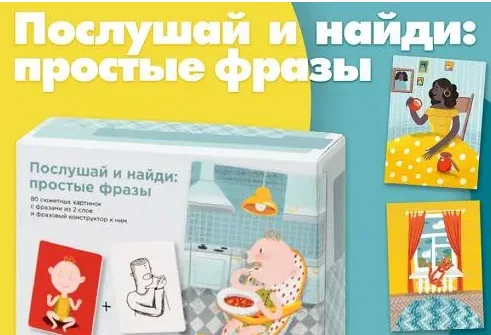 Логопедические карточки «Послушай и найди» познакомят ребенка с 11 базовыми глаголами и научат произносить 80 новых фраз из двух слов.