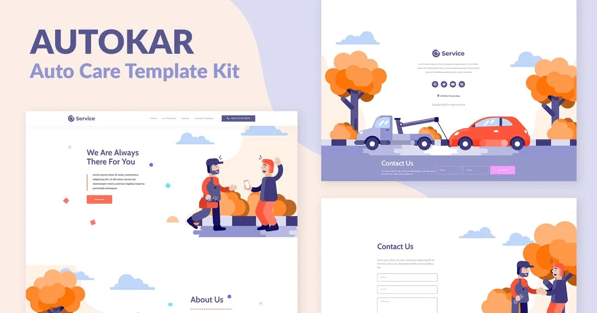 Этот комплект шаблонов подходит для автомобильных услуг, мы сделали иллюстрацию на заказ, чтобы сделать его уникальным и профессиональным, этот шаблон Kit адаптивен для любого типа устройств, таких как компьютер, планшет, смартфон и т.д.