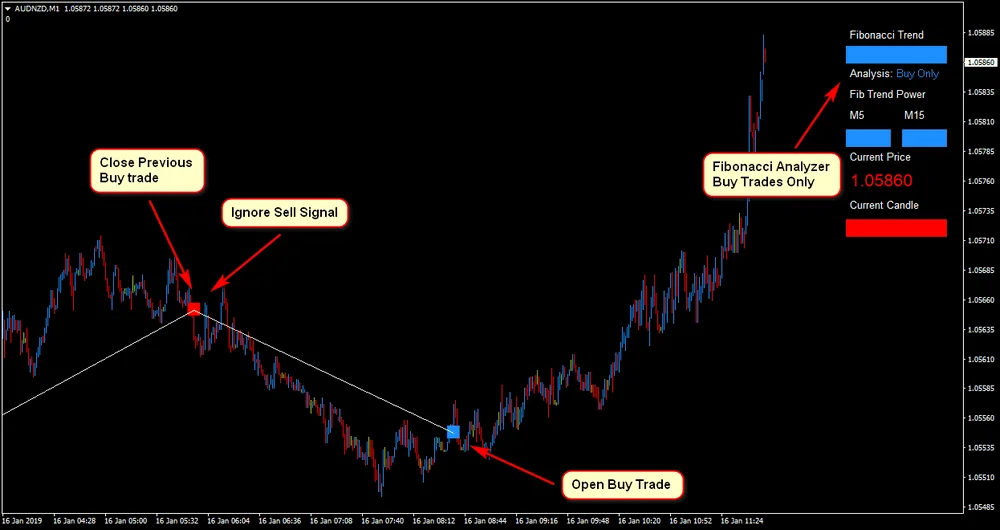 Сигнал на покупку: интеллектуальное окно «Анализ» должно отображать «Только покупка» + индикатор Fibonacci Scalper рисует на графике синюю стрелку-точку покупки (игнорируйте сигналы продажи).