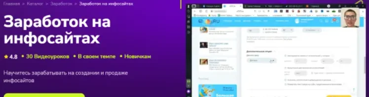 - Сможете создать успешный инфосайт с нуля. Пройдете путь от идеи до реализации, создавая свой прибыльный проект.