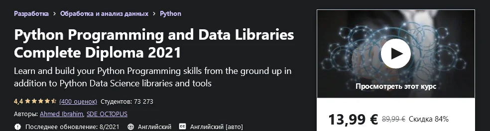 Здравствуйте и добро пожаловать на получение полного диплома по программированию и библиотекам данных Python 2021.